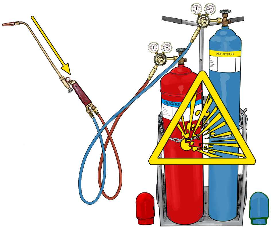 - из-за разницы давлений и неисправного обратного клапана один из газов передавливает другой, таким образом пламя через горелку переходит в шланг, регулятор и / или баллон, потенциально вызывая взрыв.