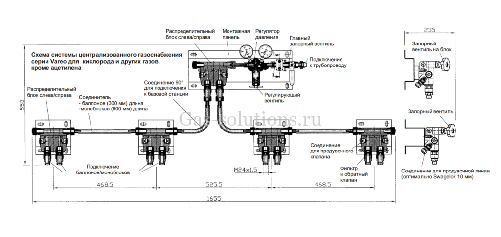 В отличие от редуктора для кислорода газовая рампа надежно закрепляется на стене, что обеспечивает максимальную безопасность при эксплуатации.