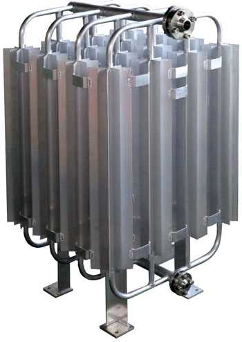 | Для газификации криогенных жидкостей не требуются энергозатраты, так как в качестве источника тепла используется только энергия из окружающей среды. Для изготовления испарителей среднего давления (4,0МПа) применяются алюминиевые трубы с наружным и внутренним оребрением (удельная поверхность теплообмена 1,4 м2 на погонный метр трубы). Применяются для газификации продукта и в качестве испарителей наддува. | |