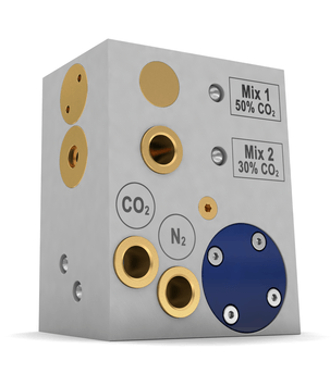 Газовый смеситель для производства двухкомпонентных газовых смесей, разработан специально для вакуумных упаковочных машин в пищевой промышленности и предназначен для применения при сильных колебаниях объёма подачи смешивающихся газов. Оборудован пропорциональным смешивающим вентилем позволяющим обеспечить бесступенчатое регулирование состава смеси. Для обеспечения корректной работы необходимо использование ресивера.
