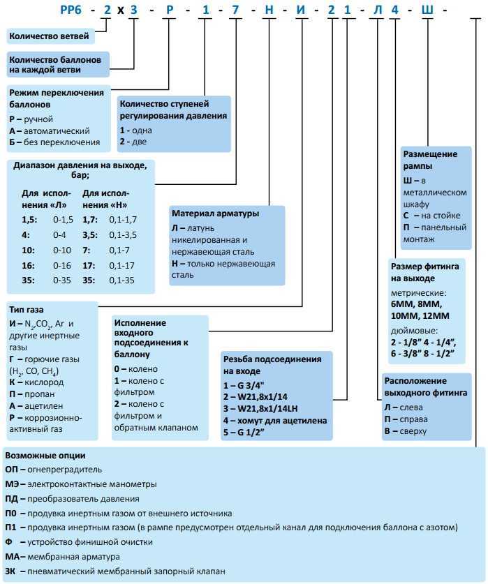 Назначение: аналитика, газовая хроматография, атомная абсорбционная спектрометрия, микроэлектроника, лазерная техника, фармацевтика и т.д. Рампа РР6 предназначена для подачи азота, углекислого газа, гелия, аргона, кислорода, водорода, пропана, ацетилена, метана, этана, криптона, ксенона, неона, моносилана, элегаза и газовых смесей, а также для коррозионно и химически активных газов, таких как аммиак, хлористый водород, сероводород. Кодировка рампы