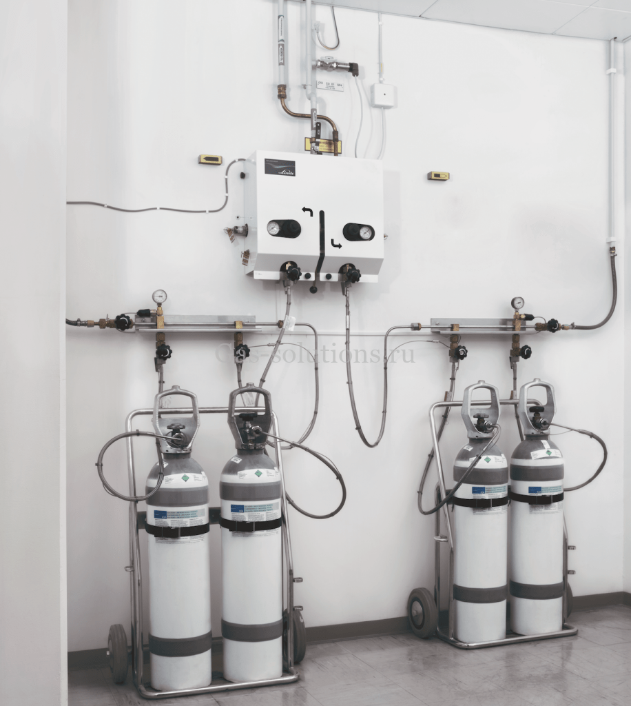Пример исполнения полуавтоматической разрядной рампы для снабжения кислородом больниц, клиник, госпиталей. Проект Linde в странах ЕС.